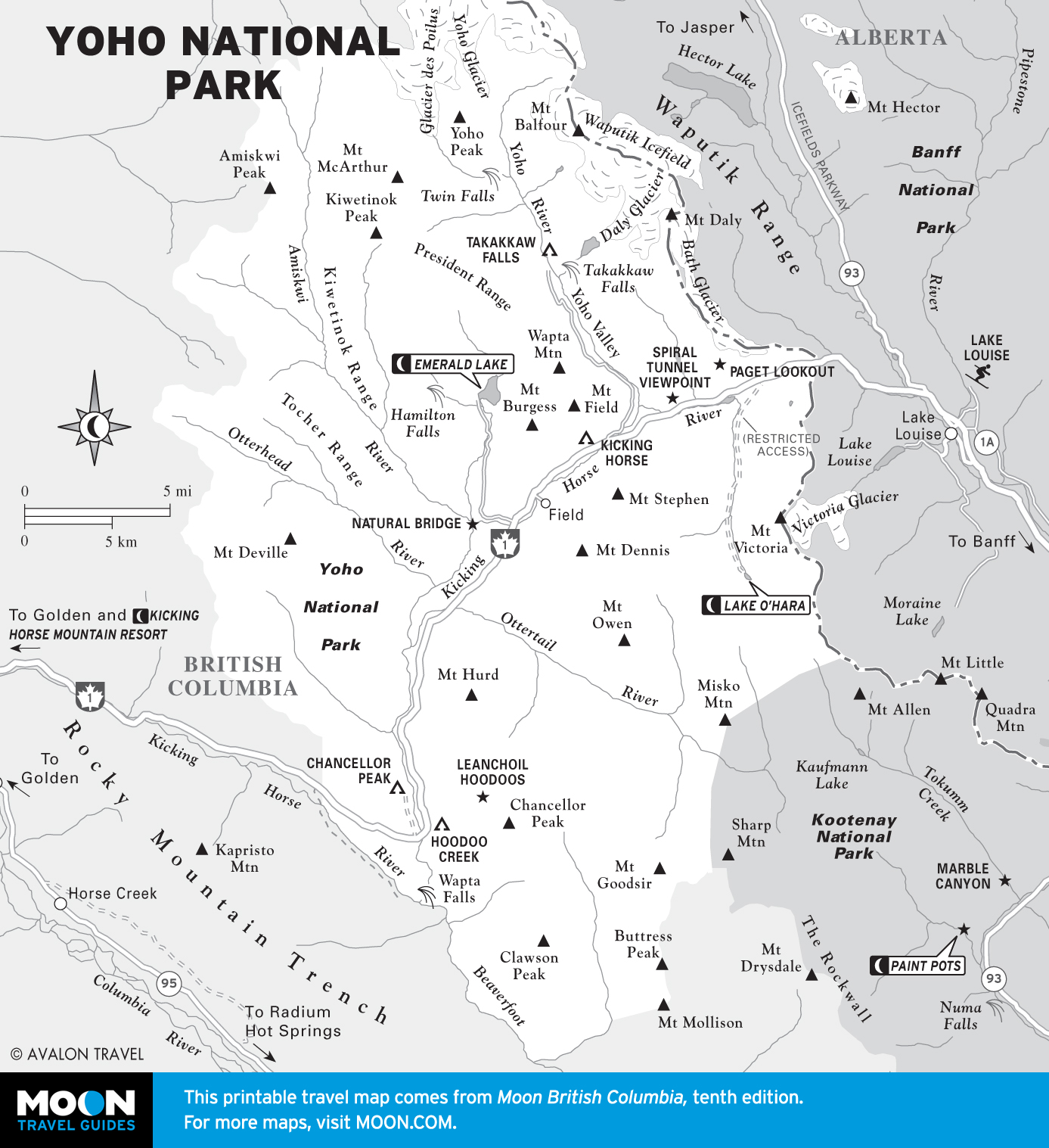 From the village of Lake Louise, the Trans-Canada Highway (Hwy-1) cuts off from Hwy-93, running west through Kamloops toward Vancouver. The first 25 mi (40 km) of this highway, west from Lake Louise and the Icefields Parkway, passes through Yoho National Park, the smallest and least known, but perhaps most feature-packed, of the contiguous Canadian Rockies parks. It’s impossible to do justice to the park in a paragraph or two, but if you like the other parks, and particularly if you enjoy backpacking, think about spending some time here too.