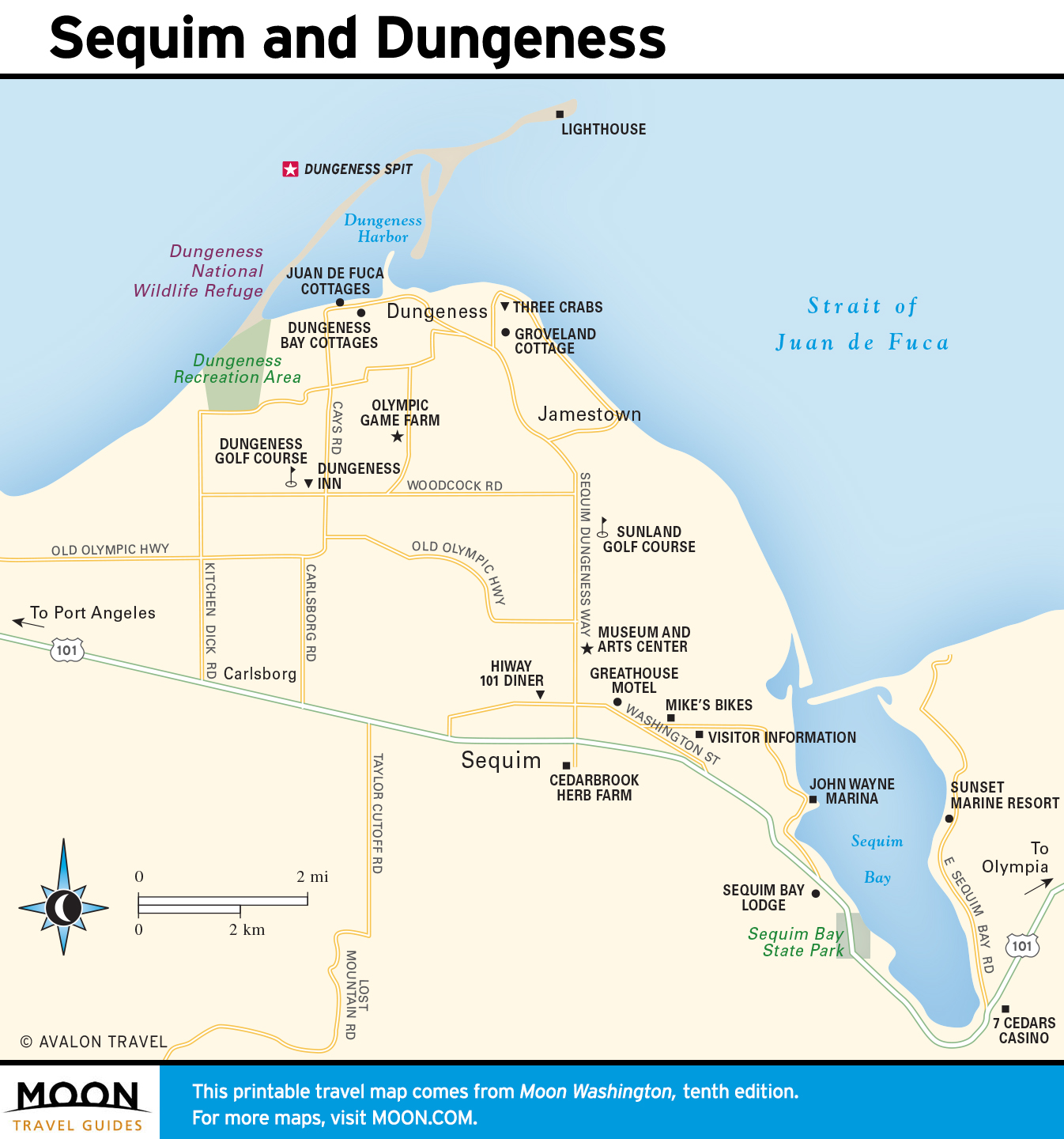 Cyclists and kayakers in particular like to stay near Sequim at the waterfront Juan de Fuca Cottages (182 Marine Dr., 360/683-4433, $129 and up), across from Dungeness Bay on a peaceful road about 7 mi (4.3 km) northwest of town.